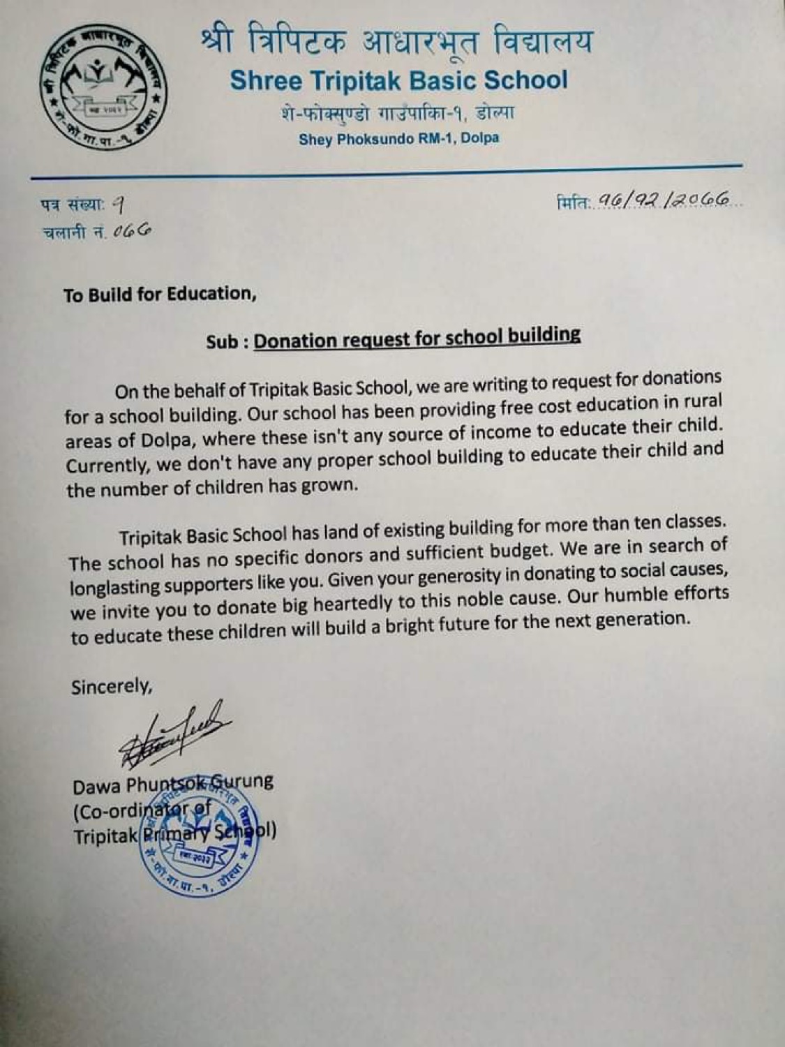 Build For Education, a 501(c)(3) nonprofit corporation registered in the State of California, USA, is currently raising funds to replace the existing dilapidated school building with a new permanent building for Tripitak Primary (Elementary) School, located in the upper Dolpa region of Nepal.